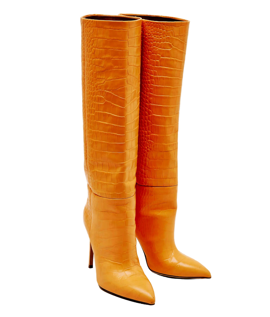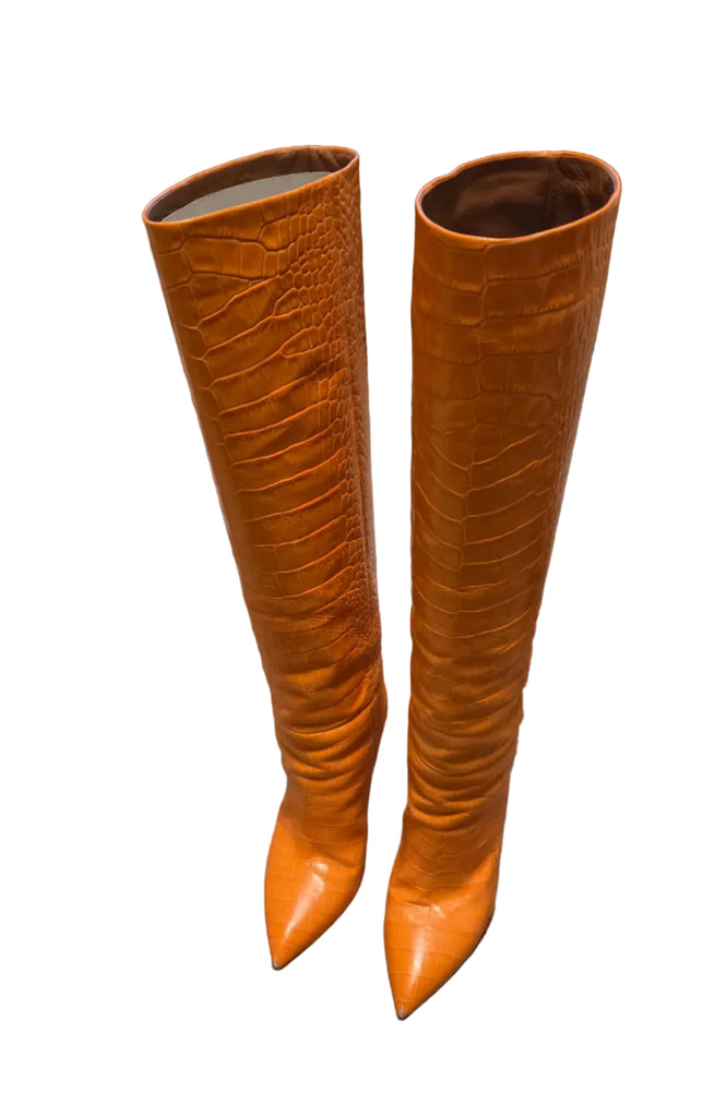 Orange Croc Embossed Leather Knee Length Boots